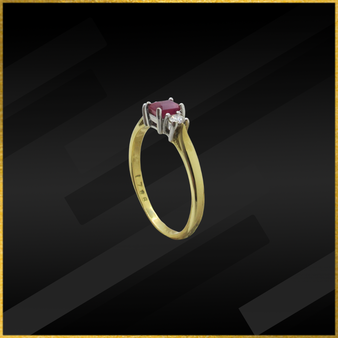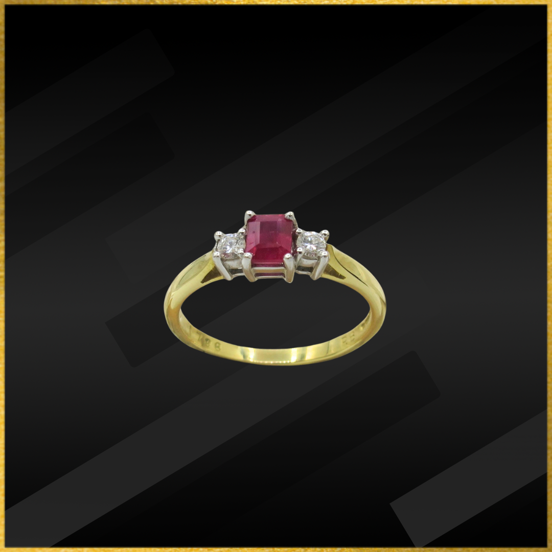 Centre ruby stone size is 4.5mm x 4mm. Diamonds measure 2.5mm.