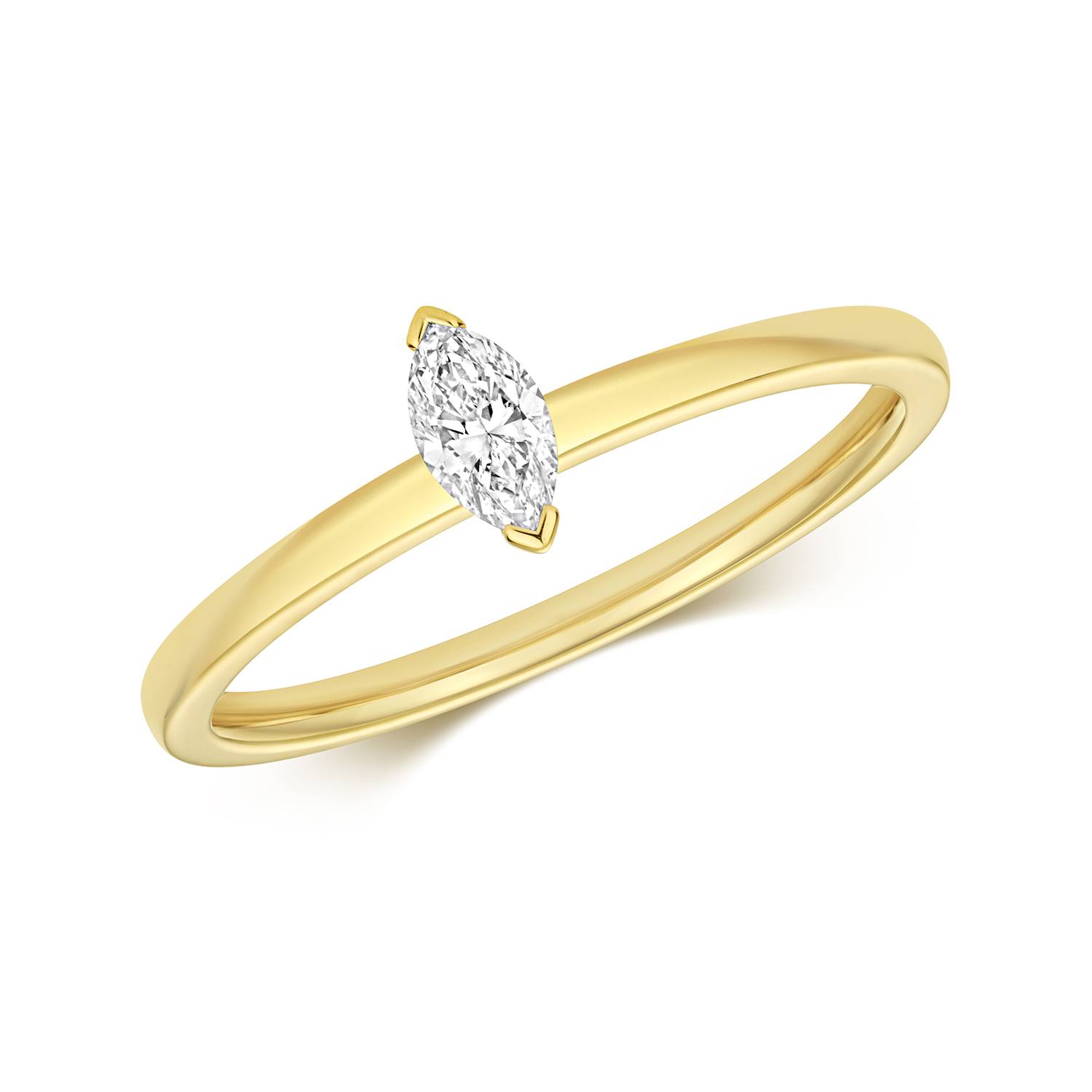 18ct gold marquise shape diamond solitaire ring. A timeless single stone diamond engagement ring crafted in 18ct yellow gold. The sparkling diamond weighs 0.20cts and is colour H clarity I1. This engagement ring would look elegant partnered with a plain or diamond set wedding band. Choose your perfect engagement ring from our stunning collection of solitaire diamond engagement rings available in a wide range of setting styles and carat weights.