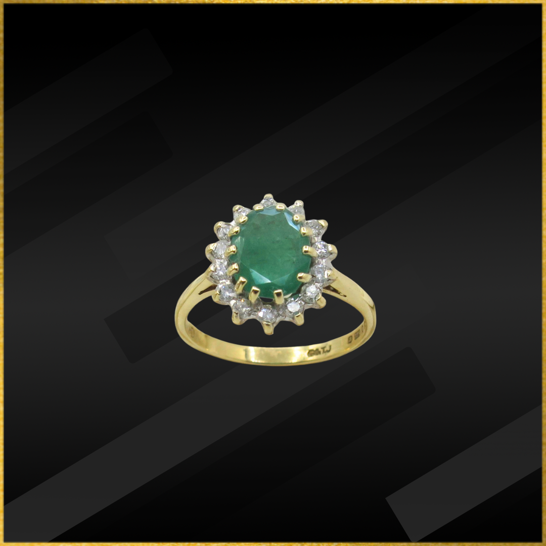 9 carat yellow gold emerald and diamond ring.