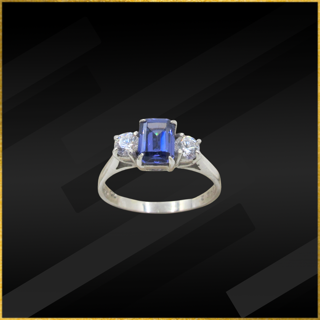 9 carat white gold tanzanite and diamond three stone ring.