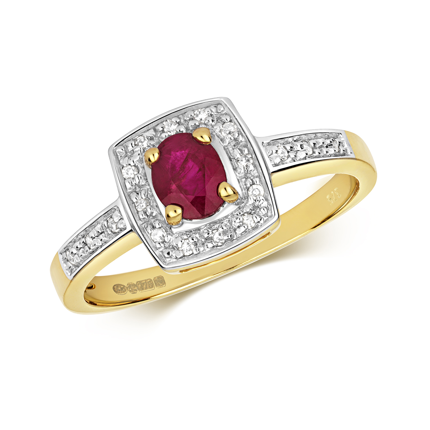 A stunning 9 carat yellow gold ruby and diamond ring. Manufactured in 9 carat yellow gold a beautiful ruby and diamond ring. Set with an oval ruby 0.38 carats and sparkling diamonds 0.06 carats.