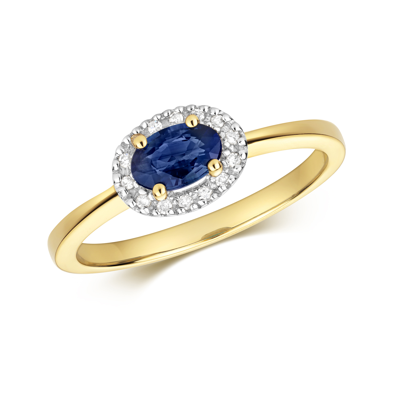A stunning 9 carat yellow gold sapphire and diamond ring. Manufactured in 9 carat yellow gold oval sapphire and diamond ring. Set with a 0.36 carat sapphire and 0.05 carats of glistening diamonds. This is a special ring.