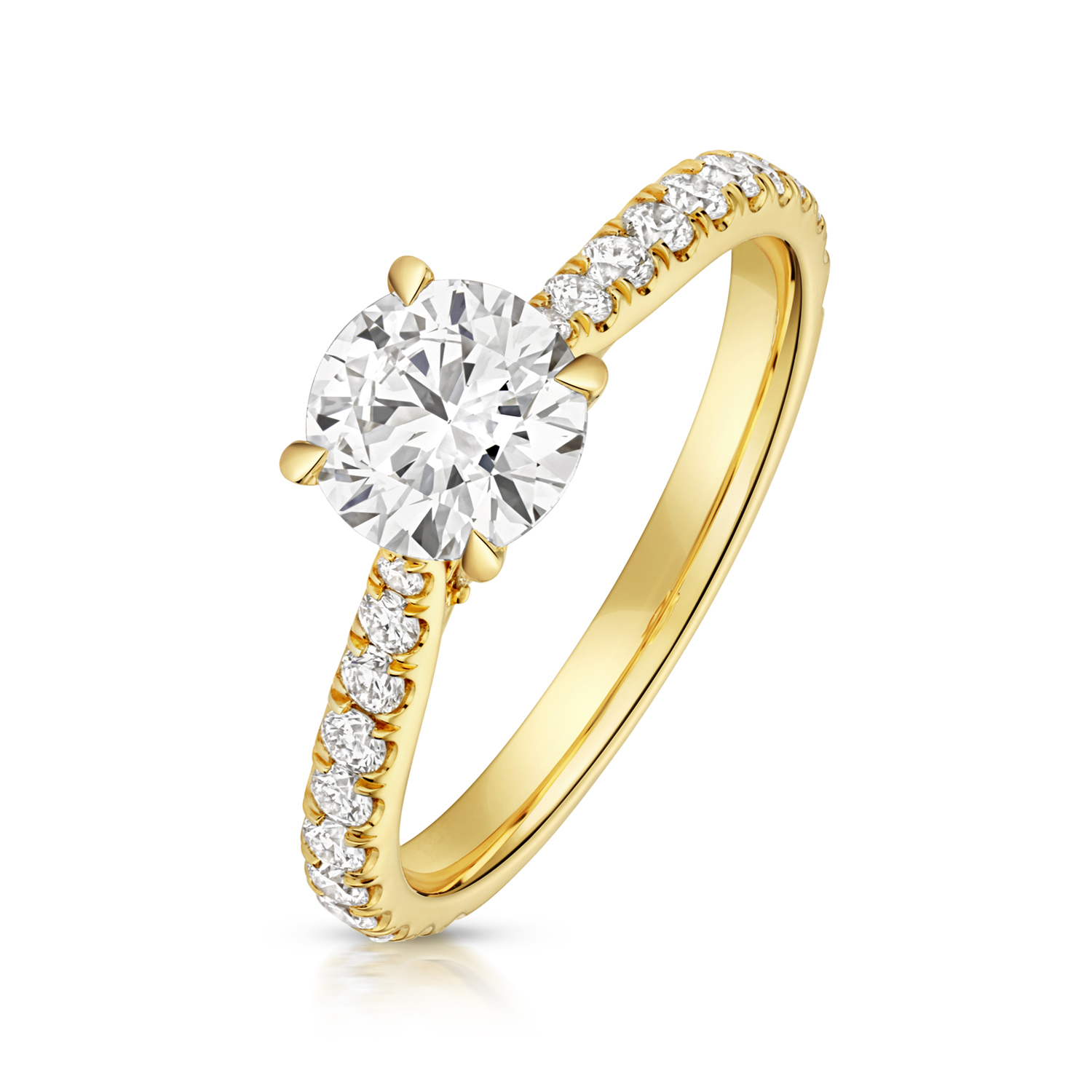 A striking ring set with a laboratory grown diamond in the centre and laboratory grown diamonds down the shoulders , made from luxury gold. There’s something particularly special about this forever piece.