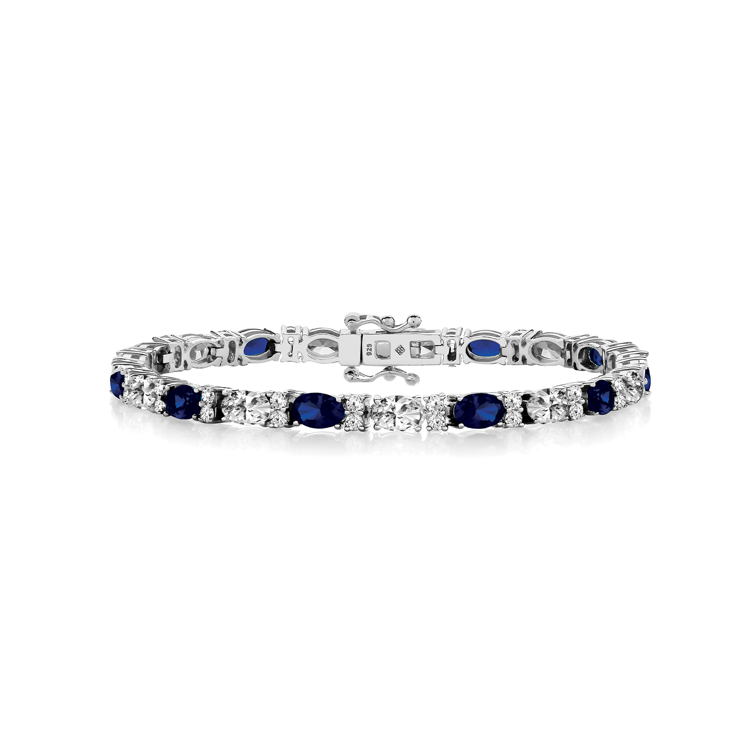 Stunning silver blue and white cubic zirconia bracelet at an affordable price. Set with ten Sapphire coloured oval shaped cubic zirconias and fifty three white round and oval shaped cubic zirconias. This will make a perfect gift. Pick your dream jewellery from our vast range available in a variety of metals and designs.